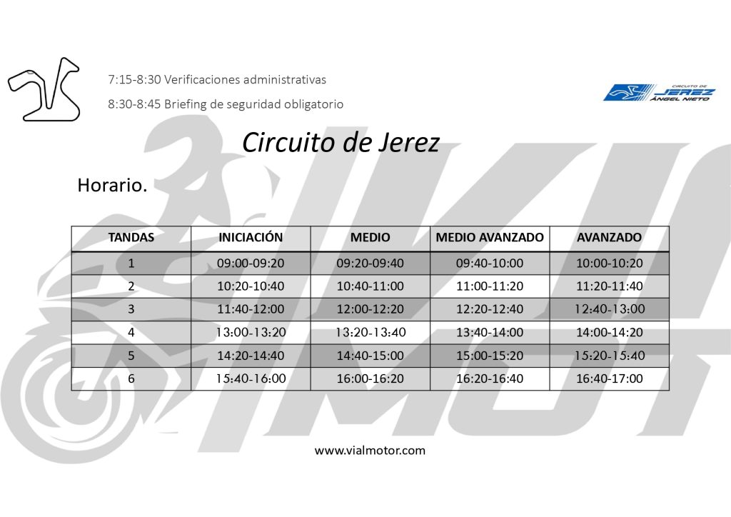 - CURSO DE PILOTAJE VIP EXPERIENCE: incluye 9 Entradas a pista de 20 minutos cada una, de las cuales 6 entradas son con monitor realizando diversas actividades y 3 entradas libres donde el piloto aplicará los conocimientos adquiridos, monitor por cada 1 ó 2 pilotos, 4 Clases de Formación en Aula,1 Bloc curso de pilotaje, bloque Setting y puesta a punto con 1 mecánico, fotos, almuerzo, camiseta de regalo Vialmotor, servicio de cronometraje, 3 cambios de neumáticos gratis durante la rodada, diploma.